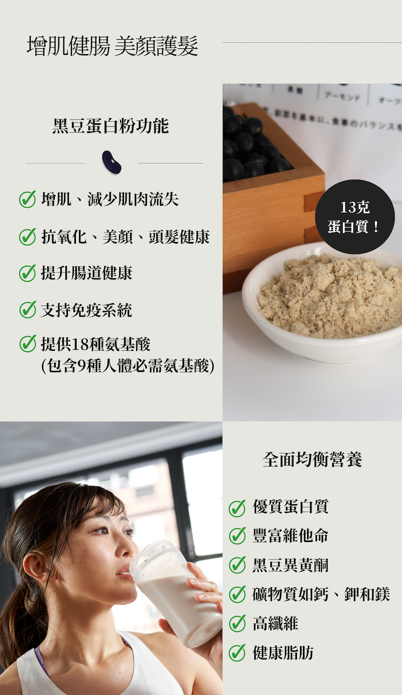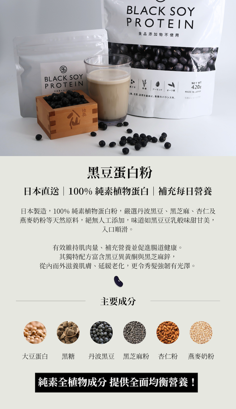 主要成分:大豆蛋白、黑糖、丹波黑豆粉、黑芝麻粉、杏仁粉、燕麥粉
