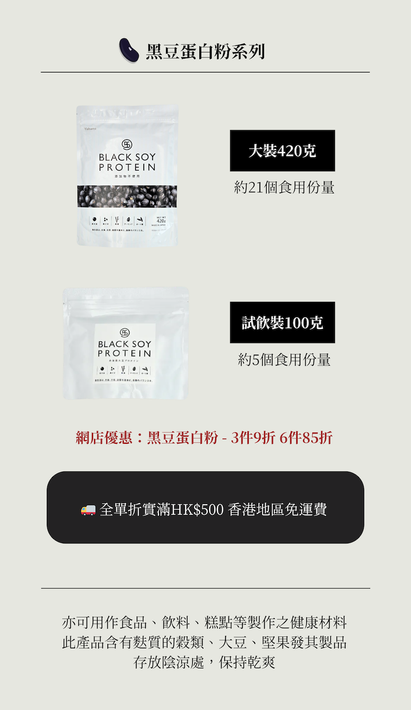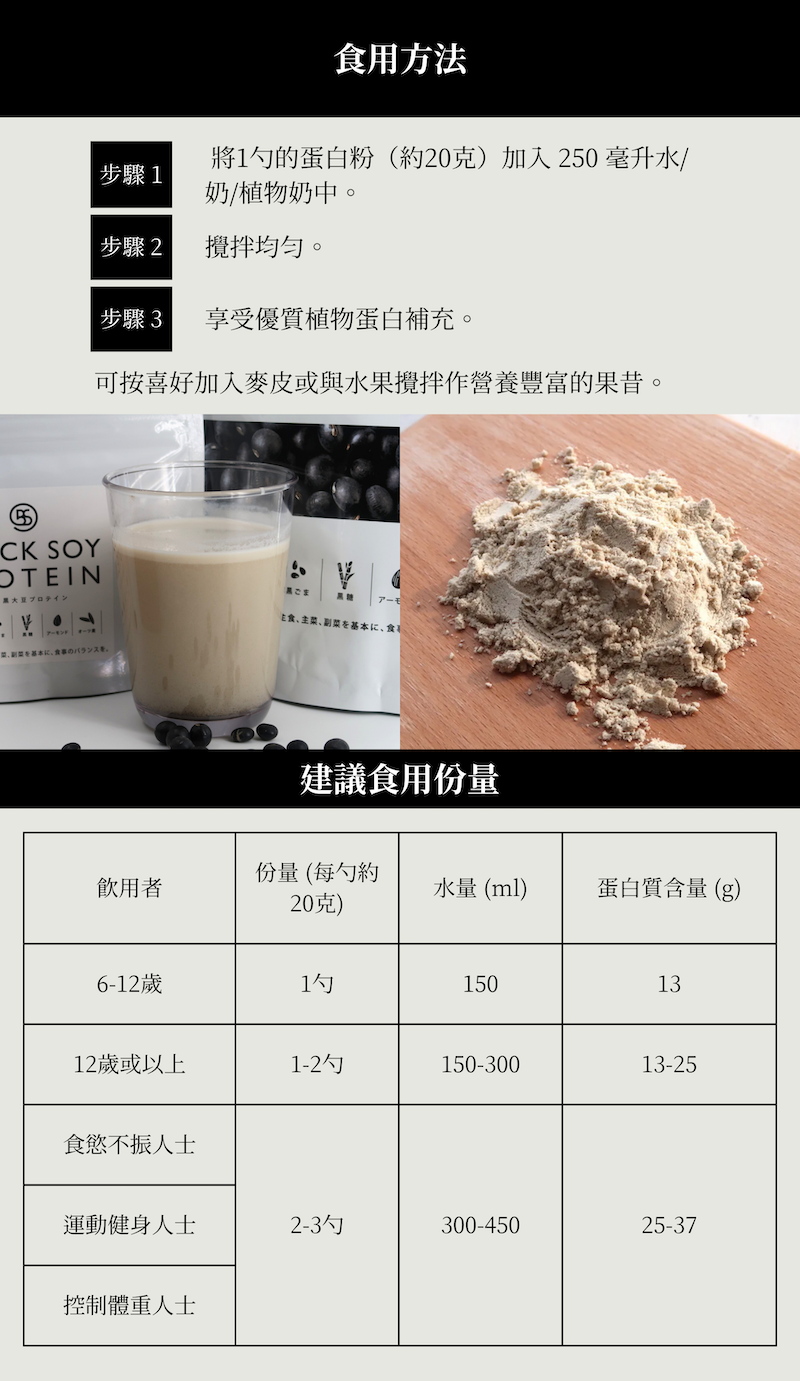 黑酢家黑豆蛋白粉於日本製造,100% 純素植物蛋白粉,嚴選丹波黑豆、黑芝麻、杏仁及燕麥奶粉等天然原料,絕無人工添加,味道如黑豆豆乳般味甜甘美,入口順滑。每次食用約1勺份量 (20克),每個食用份量含約13克蛋白質,可按喜好加入到 150-200毫升清水、麥片、牛奶或植物奶中拌勻食用;有效維持肌肉量、補充營養並促進腸道健康。其獨特配方富含黑豆異黃酮與黑芝麻鋅,從內而外滋養肌膚、延緩老化,更令秀髮強韌有光澤。