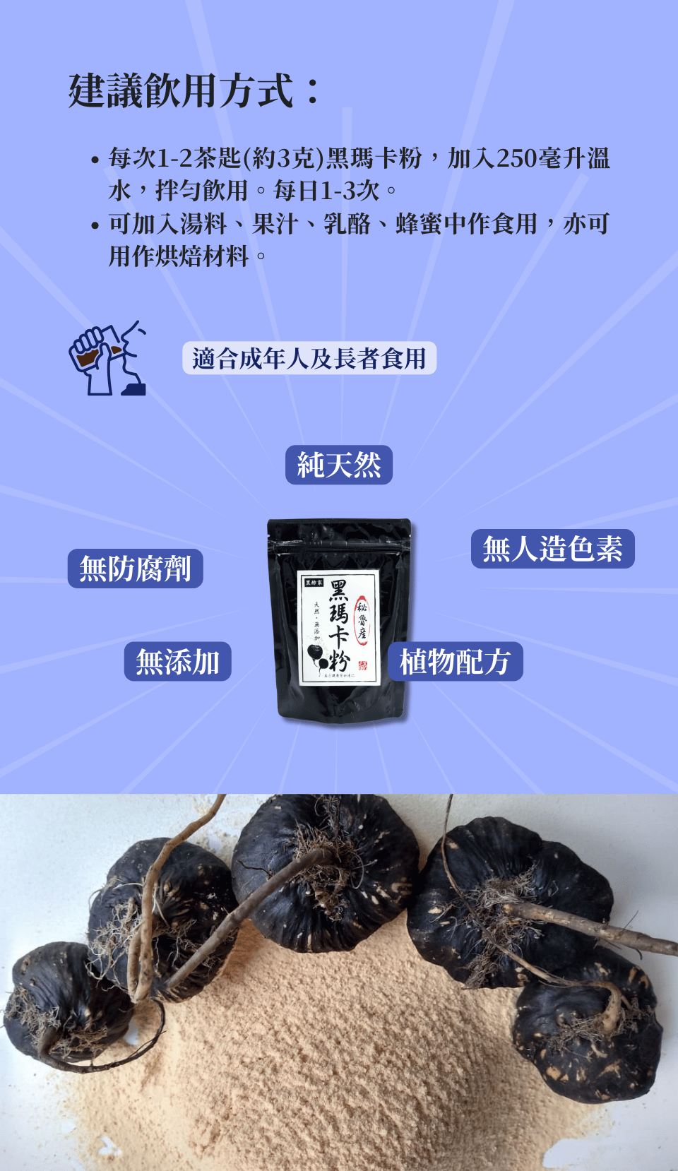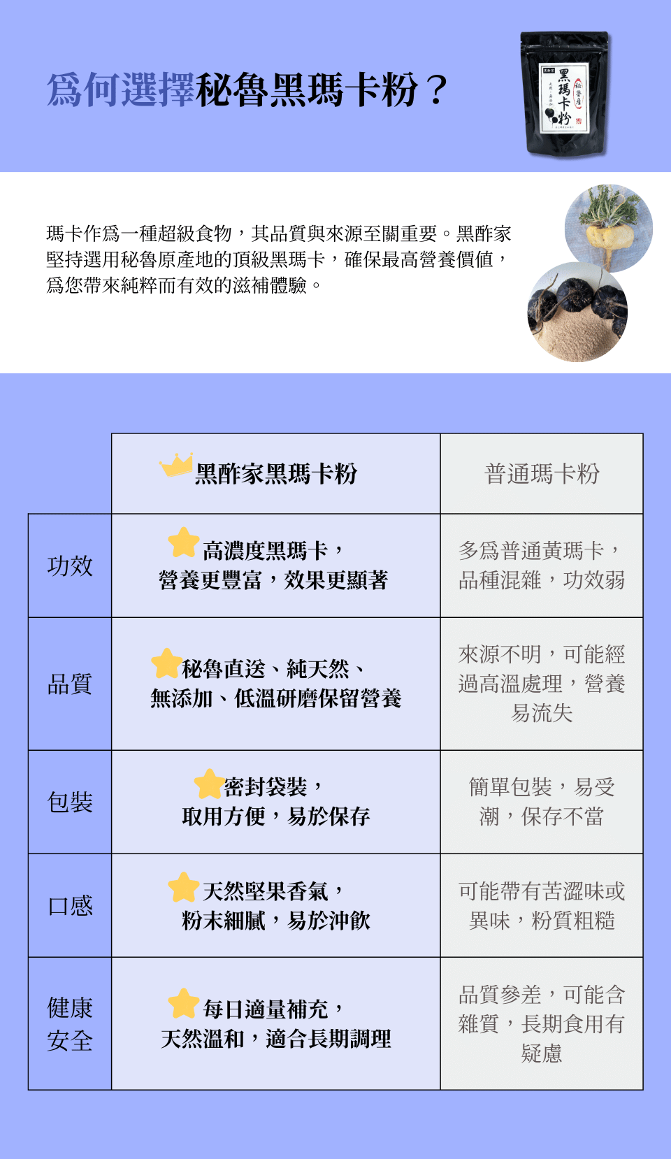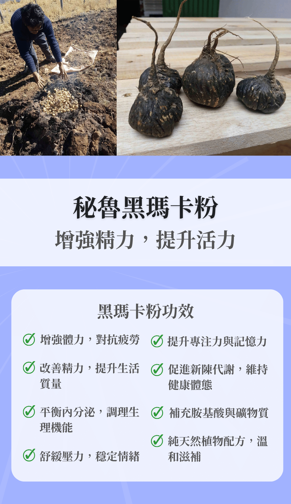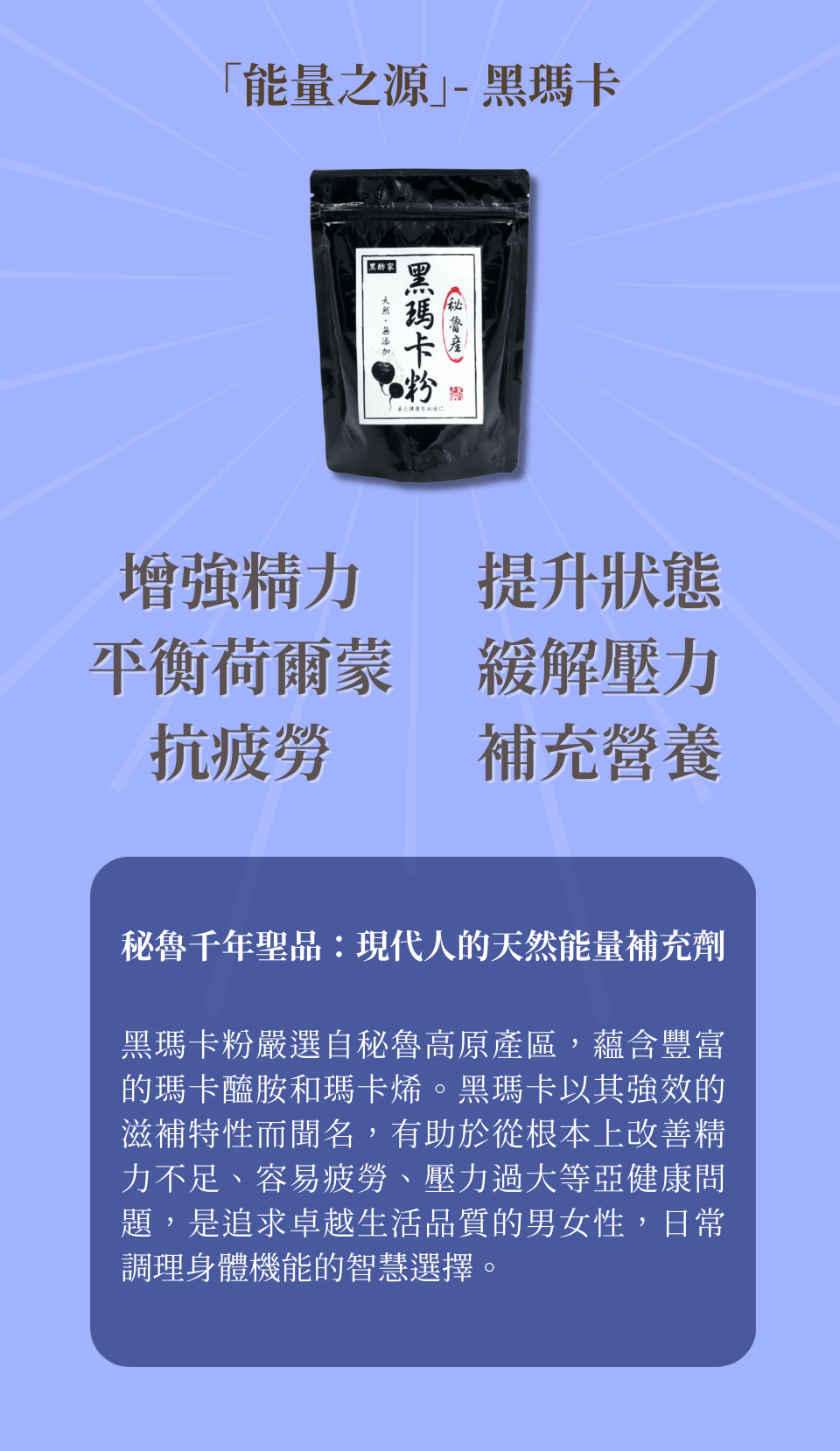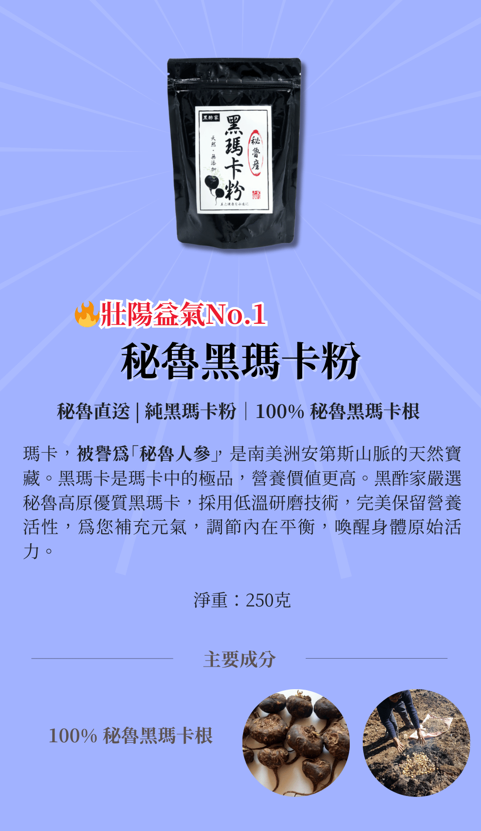 主要成分:黑瑪卡根(採用100%秘魯天然純黑瑪卡根,于混合瑪卡植物其他部分,無添加)