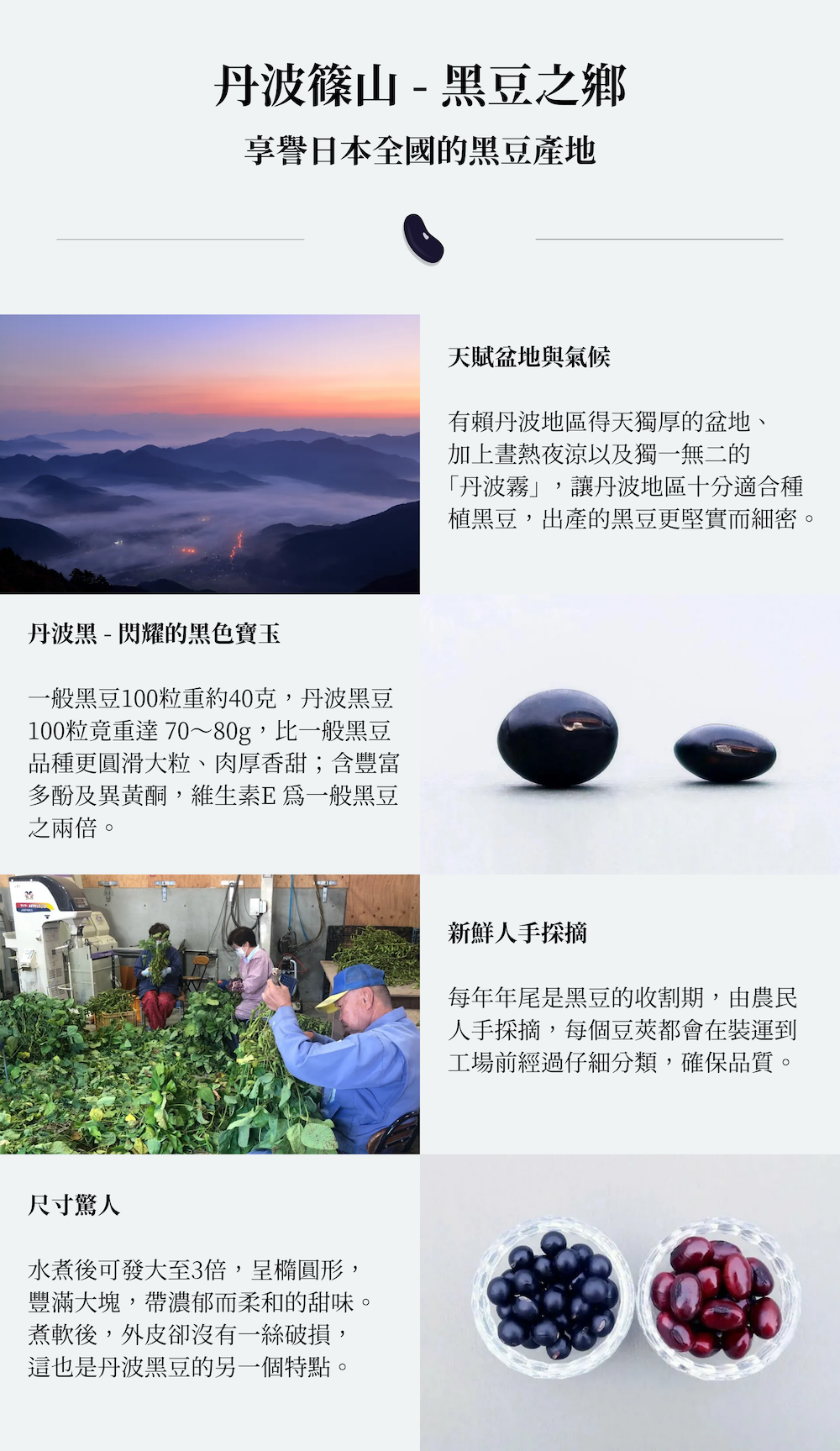 源自日本兵庫縣的黑豆之鄉 — 丹波篠山,種植黑豆歷史悠久,因其天賦盆地與氣候,出產的黑豆有「丹波の寶玉」之美譽,新鮮人手採摘、尺寸驚人,頂級品質享譽日本全國。