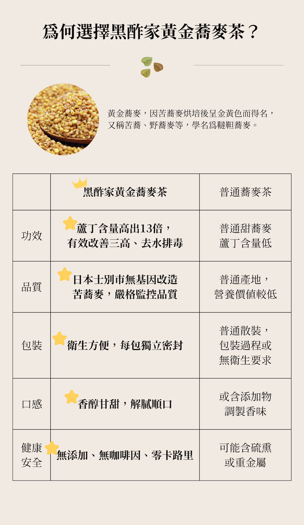 黃金蕎麥,因苦蕎麥烘培後呈金黃色而得名,又稱苦蕎、野蕎麥等,學名為韃靼蕎麥(另有一品種為黑色稱為黑金蕎麥/黑苦蕎麥)。相比蕎麥(甜蕎) ,有助降血壓、預防動脈硬化的蘆丁(芸香苷,維生素P的一種) 多出13倍以上,是新一代的養生茶。