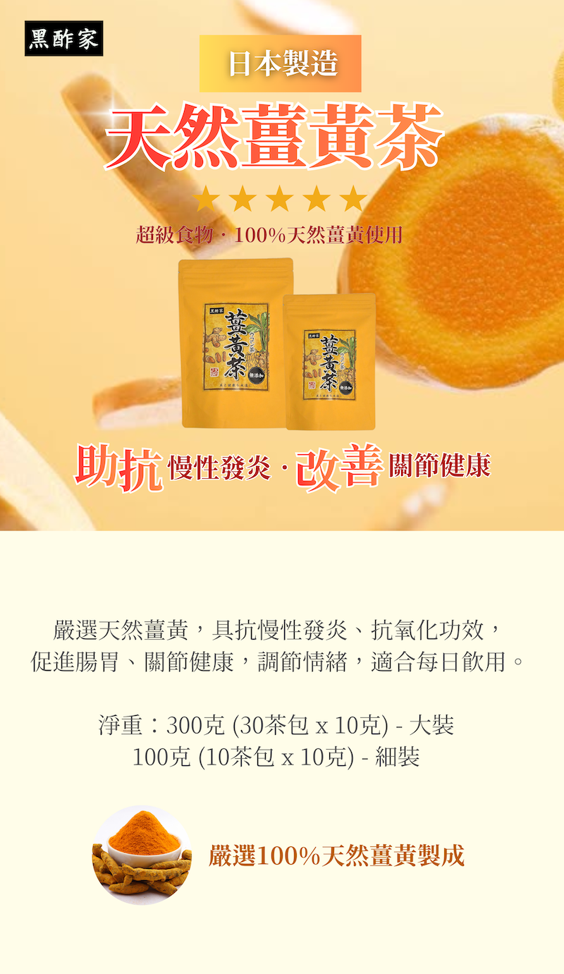 100%薑黃,色澤金黃濃郁,薑黃素含量豐厚。嚴選頂級薑黃,無咖啡因,其溫和特性有助於促進循環、調整體質。